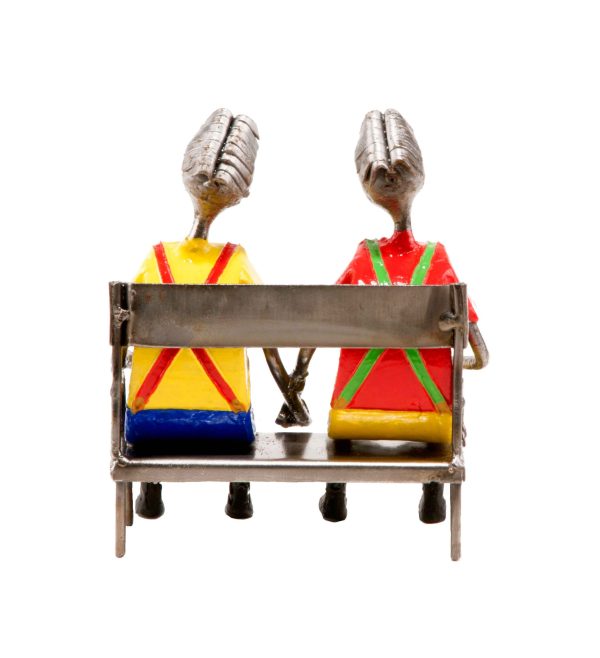 Enamorados en banca. El amor es el sentimiento más puro del hombre. Esta artesanía mexicana basada en este sentimiento busca mostrar el amor entre dos personas.